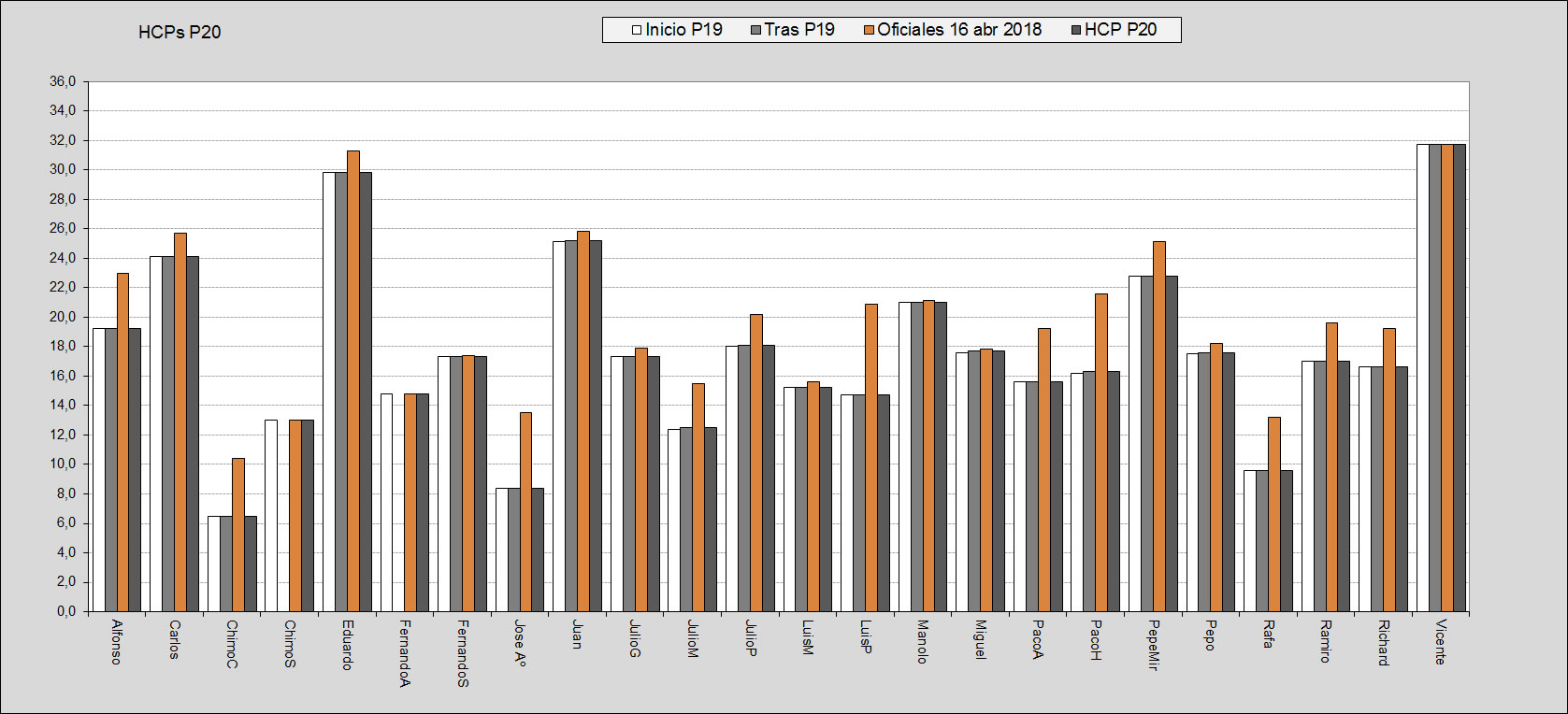 La Pool nº 20 la vamos a disputar en modalidad INDIVIDUAL STABLEFORD, a la suma de las 5 mejores, de entre 8 jornadas totales. A efectos de definición de HCPs de inicio, se ha operado adoptando el valor resultante de nuestra Pool nº19, obtenido a partir del resultado de las 2 mejores jornadas de cada uno, y aplicando las fórmulas oficiales de subida y bajada. Luego, este valor resultante de la P19 se compara con el oficial a fecha de inicio de la P20, adoptando el menor de los 2 valores. A Chimo Sevilla y Fernando Alapont, que se incorporan en esta Pool, se les asignarán sus oficiales, sujetos a la "doctrina Pérez". En las tablas siguientes figuran estos detalles: |