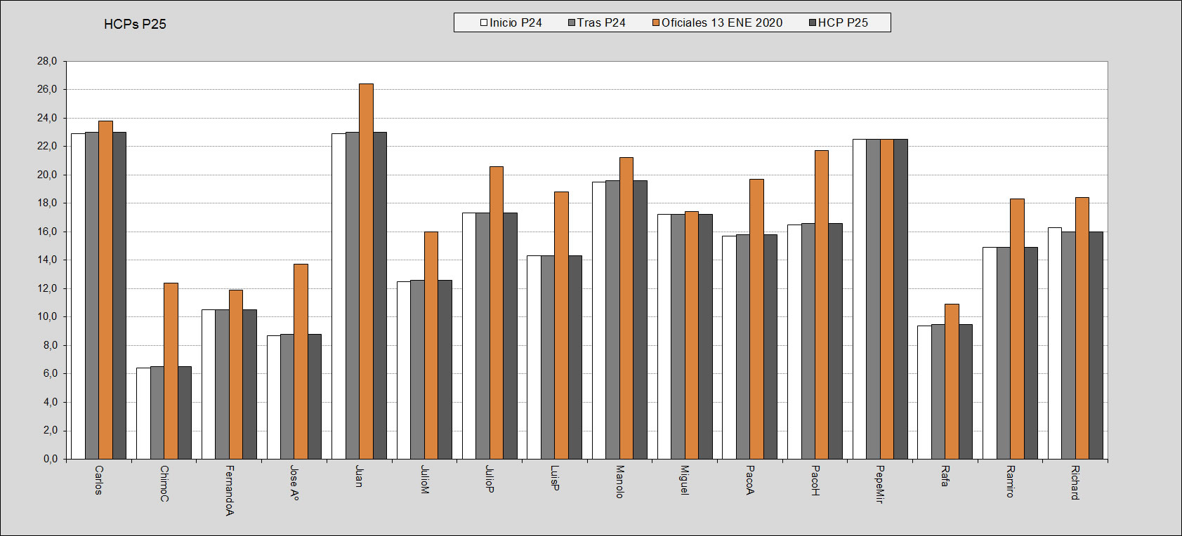 La Pool nº 25 la vamos a disputar en modalidad INDIVIDUAL STABLEFORD, a la suma de las 5 mejores, de entre 8 jornadas totales. A efectos de definición de HCPs de inicio, se ha operado adoptando el valor resultante de nuestra Pool nº 24, obtenido a partir del resultado de las 2 mejores jornadas de cada uno, y aplicando las fórmulas oficiales de subida y bajada. Luego, este valor resultante de la P24 se compara con el oficial a fecha de inicio de la P25, adoptando el menor de los 2 valores. En el caso de Chimo Sevilla, se le incorpora con su HCP anterior de Pool (10,5). En el caso de Andrés Garcia, se le incorpora con HCP 12.9, resultante de aplicar a su HCP oficial (15,8), una reducción igual a la media de las diferencias de todo el grupo entre oficiales y de Pool.. En las tablas siguientes figuran estos detalles: |